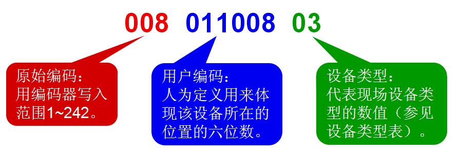 控制器所接的可編址外部設備均需進行編碼設定,每個設備對應一個原始編碼(一次碼,如下圖紅色數字)和一個用戶編碼(二次碼,如下圖藍色+綠色數字構成完整的二次碼),設備定義就是對用戶編碼進行設定。被定義的設備既可以是已經注冊在控制器上的,也可以是未注冊在控制器上的。