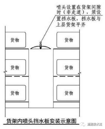 1 設置貨架內(nèi)置灑水噴頭的倉庫,當貨架內(nèi)置灑水噴頭上方有孔洞、縫隙時,可在灑水噴頭的上方設置擋水板;
