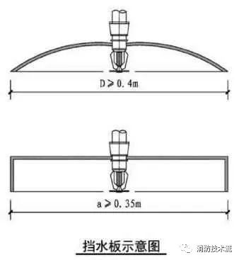 擋水板應為正方形或圓形金屬板,其平面面積不宜小于0.12m2,周圍彎邊的下沿宜與灑水噴頭的濺水盤平齊。除下列情況和相關規(guī)范另有規(guī)定外,其他場所或部位不應采用擋水板。