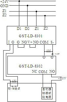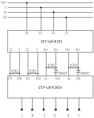 b.GST-LD-8303型模塊與GST-LD-8302A型模塊組合連接的方法如圖15所示: