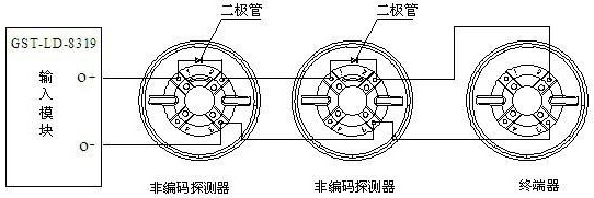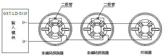 GST-LD-8319輸入模塊與非編碼探測器串聯連接時,探測器的底座上應接二極管1N5819,且輸出回路終端必須接GST-LD-8320或GST-LD-8320A終端器,終端器可當探測器底座使用,即在此終端器上可安裝非編碼探測器,其系統構成圖如圖2: