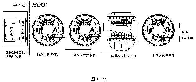 GST-LD-8332模塊箱可與防爆的感溫火災(zāi)探測(cè)器、感煙火災(zāi)探測(cè)器及手動(dòng)火災(zāi)報(bào)警按鈕一起接入火災(zāi)報(bào)警控制器系統(tǒng)中組成本安型防爆系統(tǒng)。在系統(tǒng)連線末端必須連接一4.7kΩ終端電阻,且一只編址接口模塊混接的各類防爆探測(cè)器及報(bào)警探測(cè)不能超過(guò)10只。系統(tǒng)連線如圖1- 35所示。