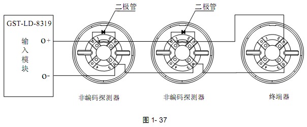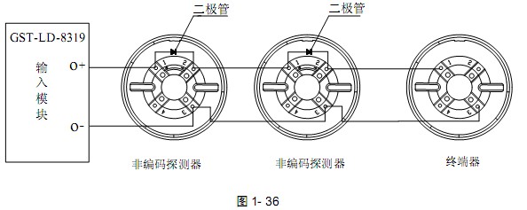 GST-LD-8319輸入模塊與非編碼探測器串聯連接時,探測器的底座上應接二極管 1N5819,且輸出回路終端必須接GST-LD-8320或GST-LD-8320A終端器,終端器可當探測器底座使用,即在此終端器上可安裝非編碼探測器,其系統構成圖如圖1- 36: