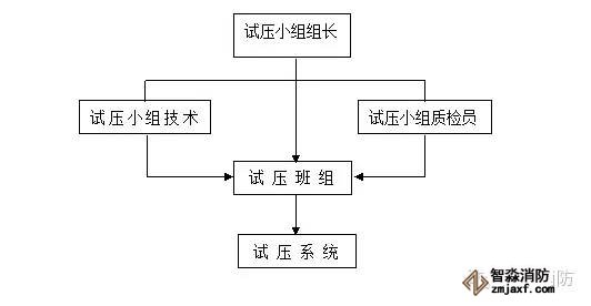 試壓時成立專門的試壓小組,試壓小組設組長一人,試壓時聽從組長指揮,試壓組織方塊圖如下: