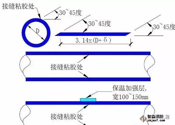 1、將順著管道方向保溫板接口由原來的900改為,采用300~450裁口粘膠連接,從而提高粘膠接觸面1.4~2倍。