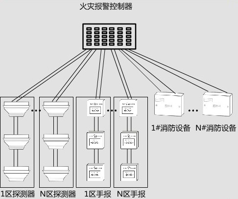 引入分區(將同一防火分區的檢測單元并接于控制器的一個輸入口)解決控制器輸入口不足及改善施工布線?;馂膱缶荒軋蟮椒阑鸱謪^,無法及時準確的報警到具體著火點。隨著建筑規模增大,防火分區和受控消防設備數量的不斷增加,依然難以滿足需求。