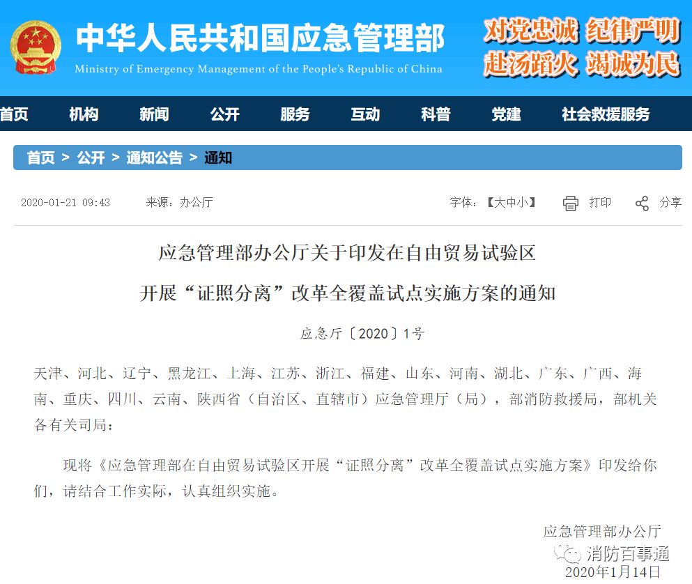 近日,應急管理部發布應急廳〔2020〕1號文件,認真貫徹落實《國務院關于在自由貿易試驗區開展“證照分離”改革全覆蓋試點的通知》(國發〔2019〕25號,以下簡稱《通知》)精神,扎實做好涉及應急管理部門有關行政許可事項改革工作。