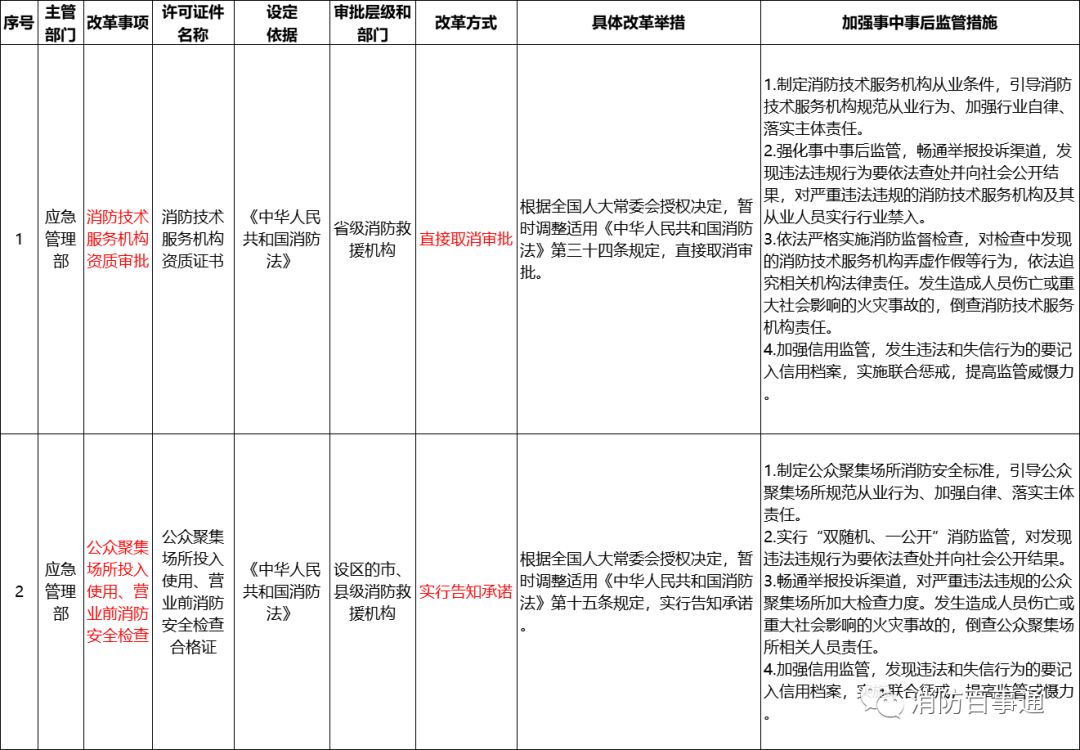 對消防技術服務機構資質審批事項和公眾聚集場所投入使用、營業前消防安全檢查事項,消防救援局和有關省級消防救援機構按照《清單》的規定,取消消防技術服務機構資質許可,公眾聚集場所投入使用、營業前消防安全檢查實行告知承諾管理。