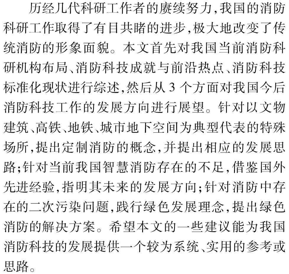 科技是推動消防工作現代化的重要力量。本文從消防科研機構布局、消防科技成就與前沿熱點、消防科技標準化等方面闡述我國消防科技發展現狀,并提出我國消防科技當前存在的不足。在此基礎上,對我國消防科技未來發展方向進行展望,提出定制消防、智慧消防和綠色消防的理念和發展思路。