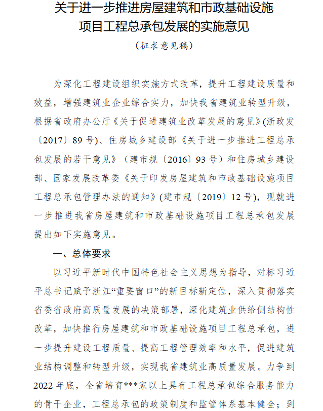 日前浙江省住建廳發布《關于進一步推進房屋建筑和市政基礎設施項目工程總承包發展的實施意見(征求意見稿)》。其中提出明確目標: