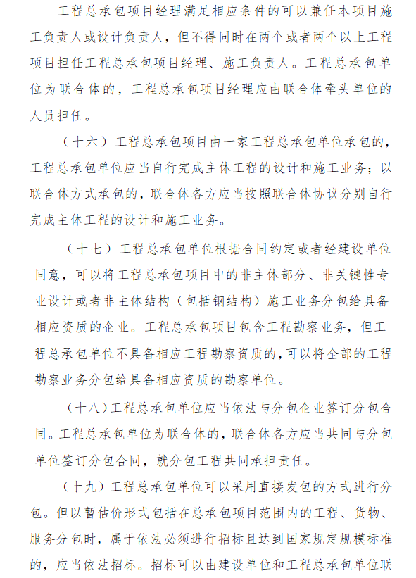 8、工程總承包項目經理滿足相應條件的可以兼任本項目施工負責人或設計負責人,但不得同時在兩個或者兩個以上工程項目擔任工程總承包項目經理、施工負責人。工程總承包單位為聯合體的,工程總承包項目經理應由聯合體牽頭單位的人員擔任。