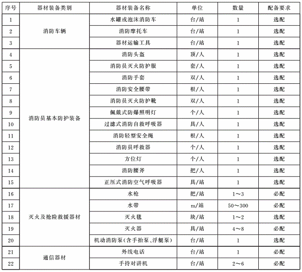 (2)根據(jù)撲救火災(zāi)和應(yīng)急救援的需要配備消防裝備器材,且不應(yīng)低于下表的要求。