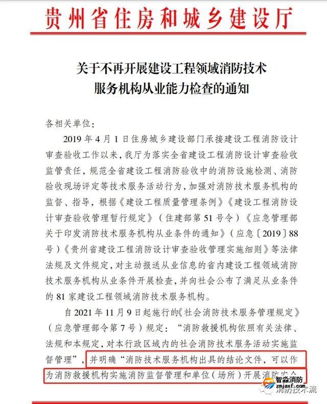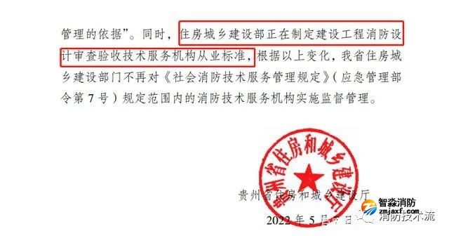 近日,貴州省住建廳發(fā)布通知,不再開展建設工程領域消防技術服務機構從業(yè)能力檢查,不再對《社會消防技術服務管理規(guī)定》(應急管理部令第7號)規(guī)定范圍內(nèi)的消防技術服務機構實施監(jiān)督管理,并透露,住房城鄉(xiāng)建設部正在制定建設工程消防設計審查驗收技術服務機構從業(yè)標準。