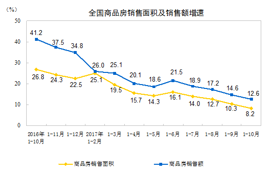 2017年1-10月份全國房地產開發投資和銷售情況;