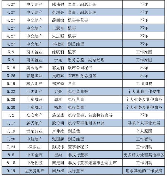中國建設報據公開報道資料不完全統計,截至9月中旬,被公開報道的房企離職高管人數超過50人,其中不乏涉及大悅城地產、越秀地產、榮盛發展、陽光100、華僑城、復星集團、中交地產、奧園地產、北辰實業、格力地產、五礦地產等數十家有一定品牌知名度的企業。