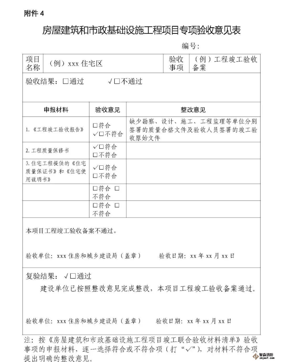 第十三條 各驗收主管部門要按照工程項目驗收情況,填寫《房屋建筑和市政基礎設施工程項目專項驗收意見表》(以下簡稱《專項驗收意見表》,見附件4),出具專項驗收通過或不通過需要整改的意見,并送至綜合窗口;對專項驗收不通過的工程項目,由綜合窗口統一匯總,一次性將整改意見反饋建設單位,整改時間不計入聯合驗收時間。
