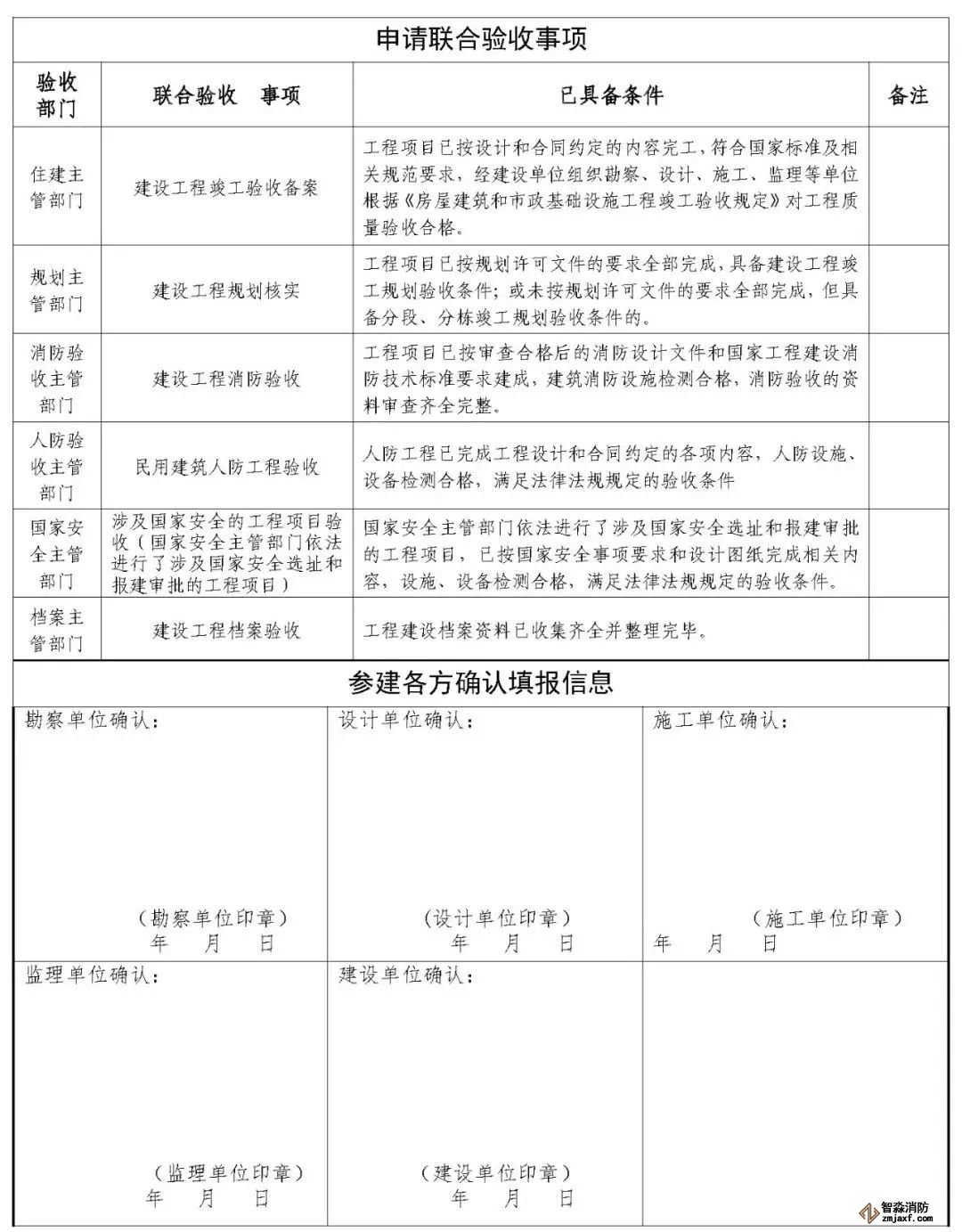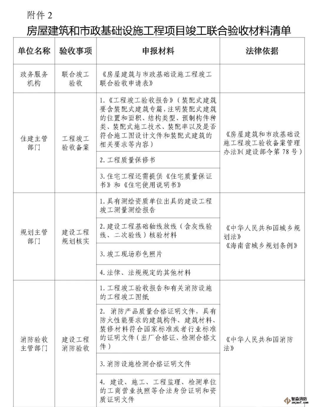 住建、規劃、消防、人防、國家安全、檔案等驗收主管部門按照職責分工,嚴格執行相關法律法規、驗收規范以及《房屋建筑和市政基礎設施工程項目竣工聯合驗收材料清單》(以下簡稱《聯合驗收材料清單》,見附件2),參與聯合驗收;各驗收主管部門要主動服務,在工程項目建設過程中指導建設單位提前按相關規范完成各類檢測及驗收,并積極做好聯合驗收前有關指導工作。