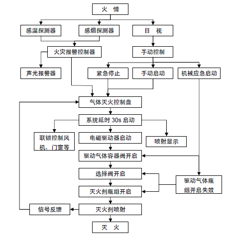 1) 自動啟動:從火災探測報警、關閉聯動設備以及釋放滅火劑瓶組均由系統自動完成,不需要人員介入的操作和控制方式。