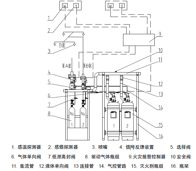 系統由滅火劑瓶組、驅動氣體瓶組、選擇閥、液體單向閥、連接管、集流管、安全閥、信號反饋裝置、氣體單向閥、低泄高封閥、噴嘴、氣控管路、瓶架、驅動氣體瓶架等組成。智淼君安(江蘇)消防工程技術有限公司http://www.cqcpsy.cn/